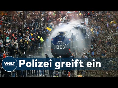 Trotz Einsatzes von Wasserwerfern scheint sich die Demonstration zwischen dem Brandenburger Tor und dem Reichstagsgebäude in Berlin zunächst nicht ...